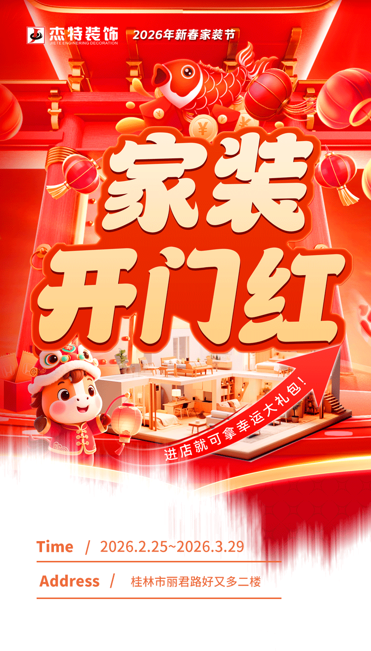 2026新春家装节 | 杰特装饰家装开门红活动正式启动! 更新时间:2026-03-18 点击数:3 Tag: 上一篇:18年深耕桂林!杰特装饰第八届“能工巧匠节”启幕:冠军工艺+大师设计,还原你心中的理想家 下一篇:315诚信筑家 | 桂林消费者协会认证,365天坚守品质承诺
